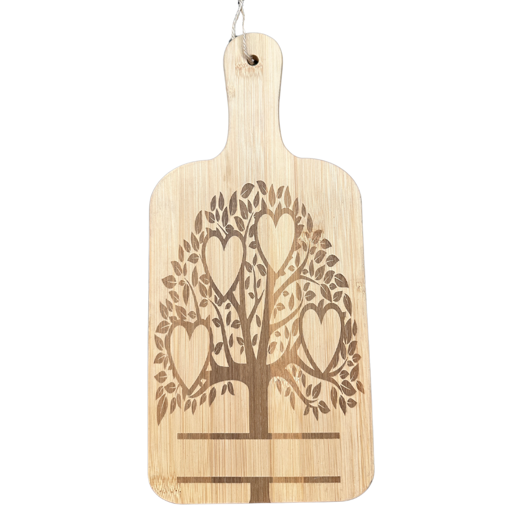 Celebrate family roots and lasting memories with this beautifully engraved bamboo cutting board, featuring a heart-accented family tree design. With space to customize each heart with names and add a family name or special date beneath, this piece becomes a truly one-of-a-kind keepsake.